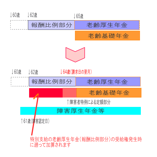 障害者特例は適用要件に該当し、請求することで、請求日の属する月の翌月分から「報酬比例部分」に加えて、「定額部分」(場合によっては、「加給年金額」)が支給されることになります。