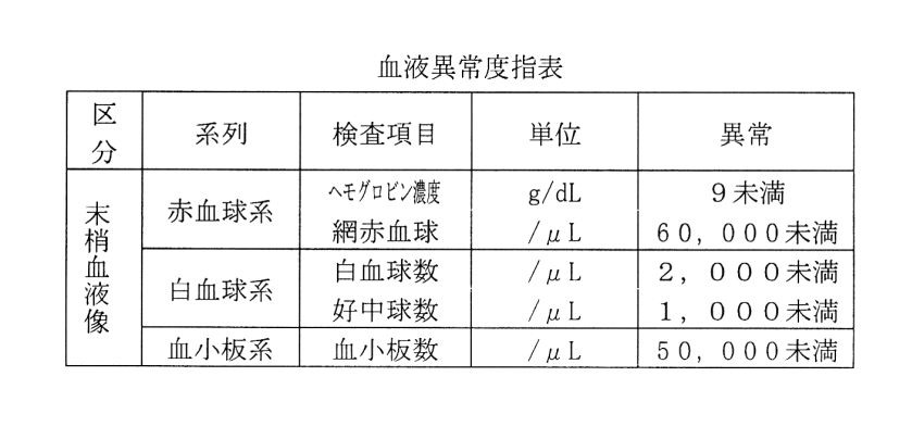 血液疾患については、貧血、感染、発熱、各種臓器組織での出血性病変等の病状が継続するものであって、かつ、次表に掲げる血液検査異常度指表の3系列のうち1系列以上の検査成績が、異常を示すものとする。